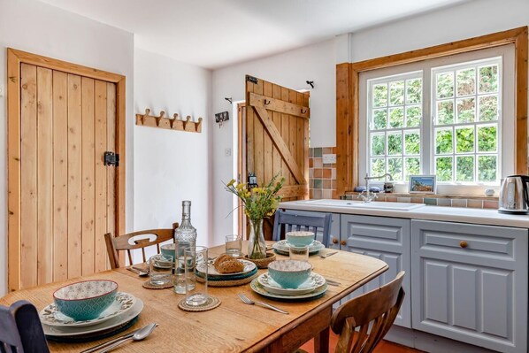 A sloped path leads up to the cottage, from where there are superb views over the village and sea. Inside, it exudes warmth and personality throughout with a welcoming, farmhouse-style kitchen/diner at its heart. Colourful tiles, painted cabinets and a central table invite sociable mealtimes, while a cosy lounge with an assortment of seating is ideal for unwinding after the day’s adventures. Upstairs, two thoughtfully styled bedrooms – one spacious double with a wrought-iron bed and a cosy twin with fairy lights – offer restful spaces with a hint of retro charm. The family bathroom is bright and practical, while outside the terraced garden drapes over three levels, inviting you to dine alfresco, fire up the small gas BBQ or soak up panoramic views from the top tier. Secure bike storage and direct access to scenic footpaths make this a great choice for walkers and cyclists, while a permit is provided for a local car park (400 metres).