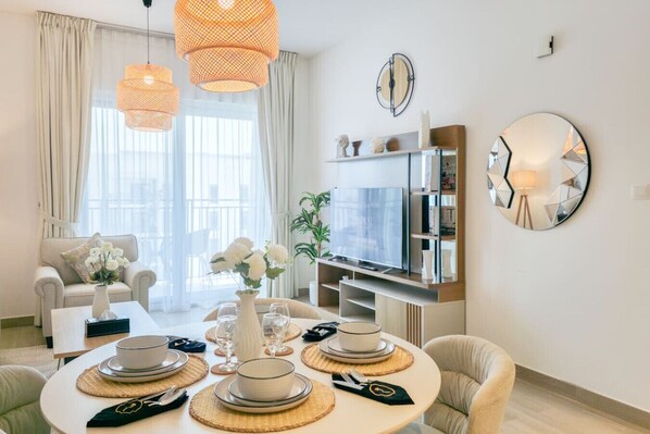 This comfortable 1-bedroom apartment in Waters Edge, Building 8 is thoughtfully designed for a cozy and convenient stay. The living area features a 3-seater sofa and a single armchair, complemented by a large LED TV—perfect for relaxing evenings. A dining table for four allows for shared meals, while the balcony offers two chairs and a table where you can unwind and enjoy the outdoor views. The fully equipped kitchen includes all the essential amenities you need to prepare meals during your stay.