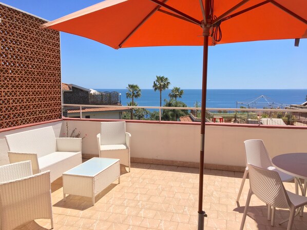 Flott utsikt over Acitrezza-bukten fra leiligheten + 100 kvm terrasse, slapp av og solarium.