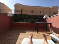 Været var ikke det beste da vi var der, det blåste kuling i tre dager, så da var det greit at terassen var en bås med høye murvegger. Hadde været vært fint hadde vi irritert oss over de samme murveggene og total mangel på utsikt. Gode solsenger på terassen.