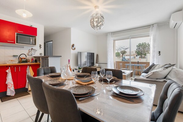 Alle gjesterommene på La Brise d'Agde - 3km de la Plage kan skilte med komfort i form av klimaanlegg samt fasiliteter som wi-fi (inkludert) og spisebord.
