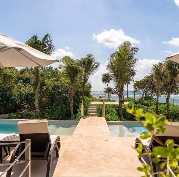 Discover the charm of this luxurious two-bedroom penthouse just steps from the beach, offering captivating views of the beach. Relax in the seven rooftop pools with panoramic views of the Caribbean Ocean.