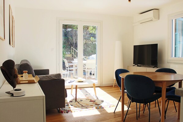 Alle gjesterommene på Appartement avec jardin et terrasse byr på komfort i form av klimaanlegg og eget spiseområde samt fasiliteter som wi-fi (inkludert) og kontorstol.