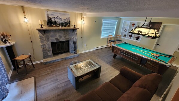 Basement: (walkout) has a living room (fireplace) and foosball table (coffee table), game area with a pool table, 1 bathroom. Washer and Dryer available for use.
