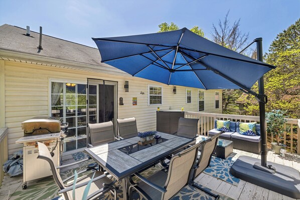 Large deck with big table, propan grill , daily visits from local deer.