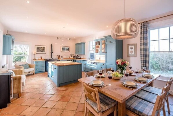 This well-equipped kitchen is ideal for entertaining with family and friends. The table is large enough to seat 12 guests and there's a sofa and a comfy chair so you can sit and chat with the ‘chef’ (we know some excellent caterers if you’d like to arrange a celebration meal). The door to the deck makes indoor/outdoor dining easy.