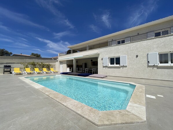 Et basseng 8,5x4m 1,5m dybde, flislagt terrasse på 100m ² (fluktstoler, ottomaner). Sikkert gjerde for barn.