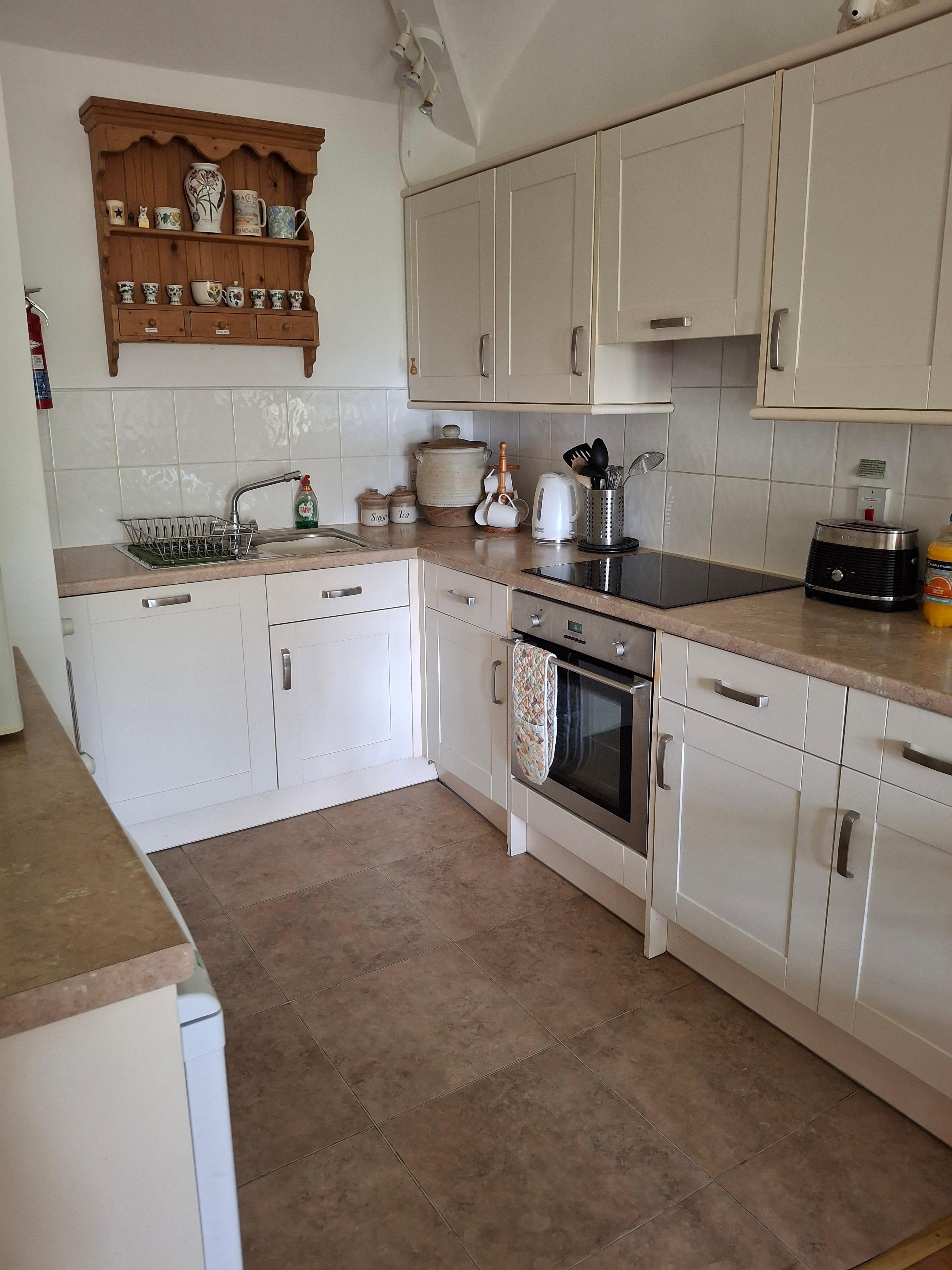 Kjøkkenet er fullt utstyrt med skap, vannkoker, brødrister, kjøleskap, liten fryser, vask, oppvaskmaskin og vaskemaskin. Det er en elektrisk ovn med induksjonstopp også en mikrobølgeovn.