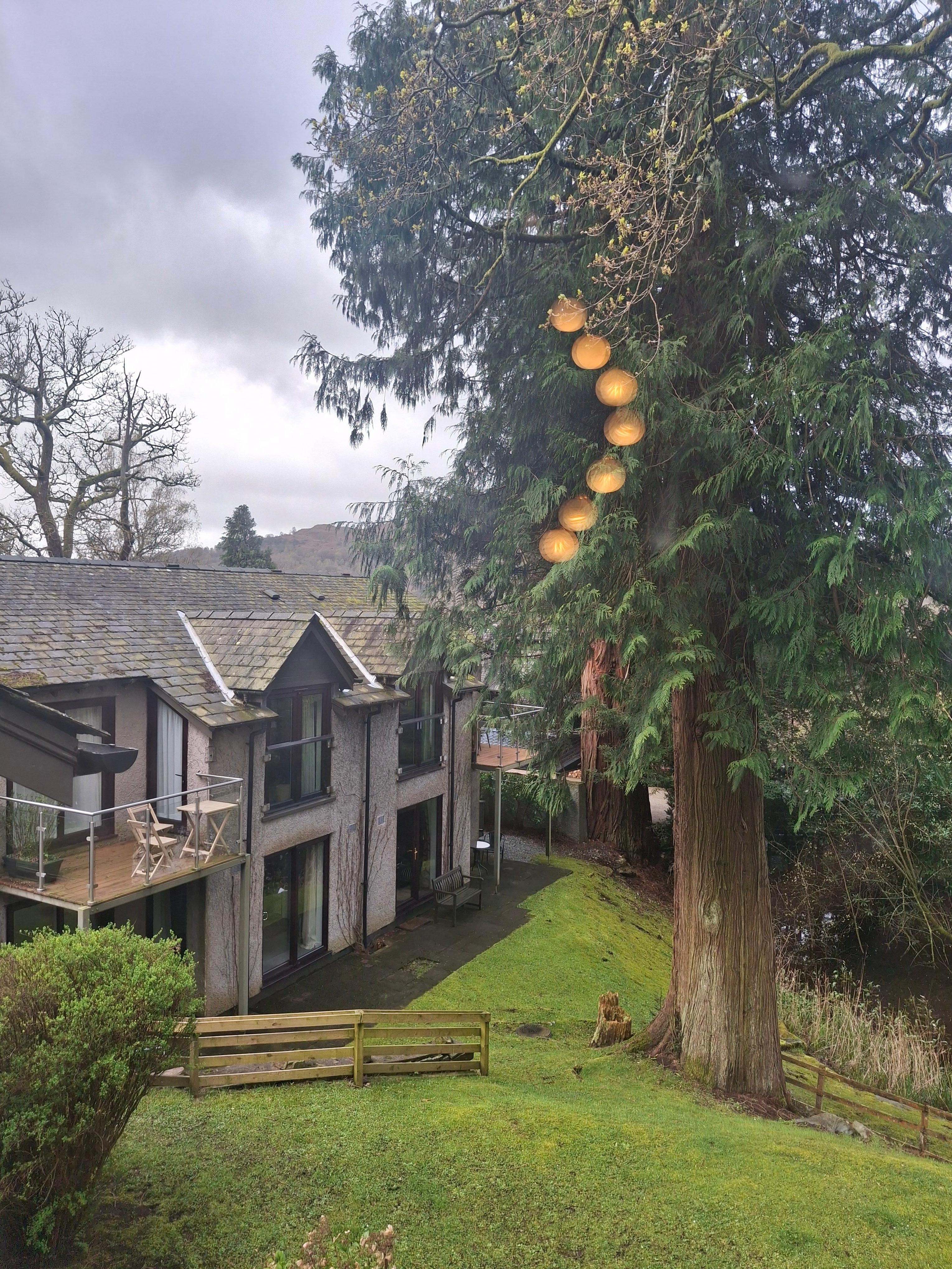 En utvendig trapp fører til Flat 11, "Loughrigg". Inne i inngangspartiet fører til et åpent område med et bildevindu med utsikt over privat eiendom.