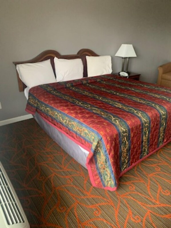 Although this place stated they were renovated, I found this to be misleading. The toilet was new, and the tile looked like us was installed by unskilled workers. The shower curtain rod and grab bars were stained and peeling. The walls were dirty, the bedspread was stained, furniture was worn, scratched. We slept in our clothes and coats on top of the bedspread bc we just felt things were not clean. The nightstand lamp did not work. Non of the usb outlets works in any lamp. The microwave oven was dirty. Worst was the door to the room did not have a secondary lock for security. They had been broken off. We jammed the one chair provided against the door. They required full payment upfront (2nights).
