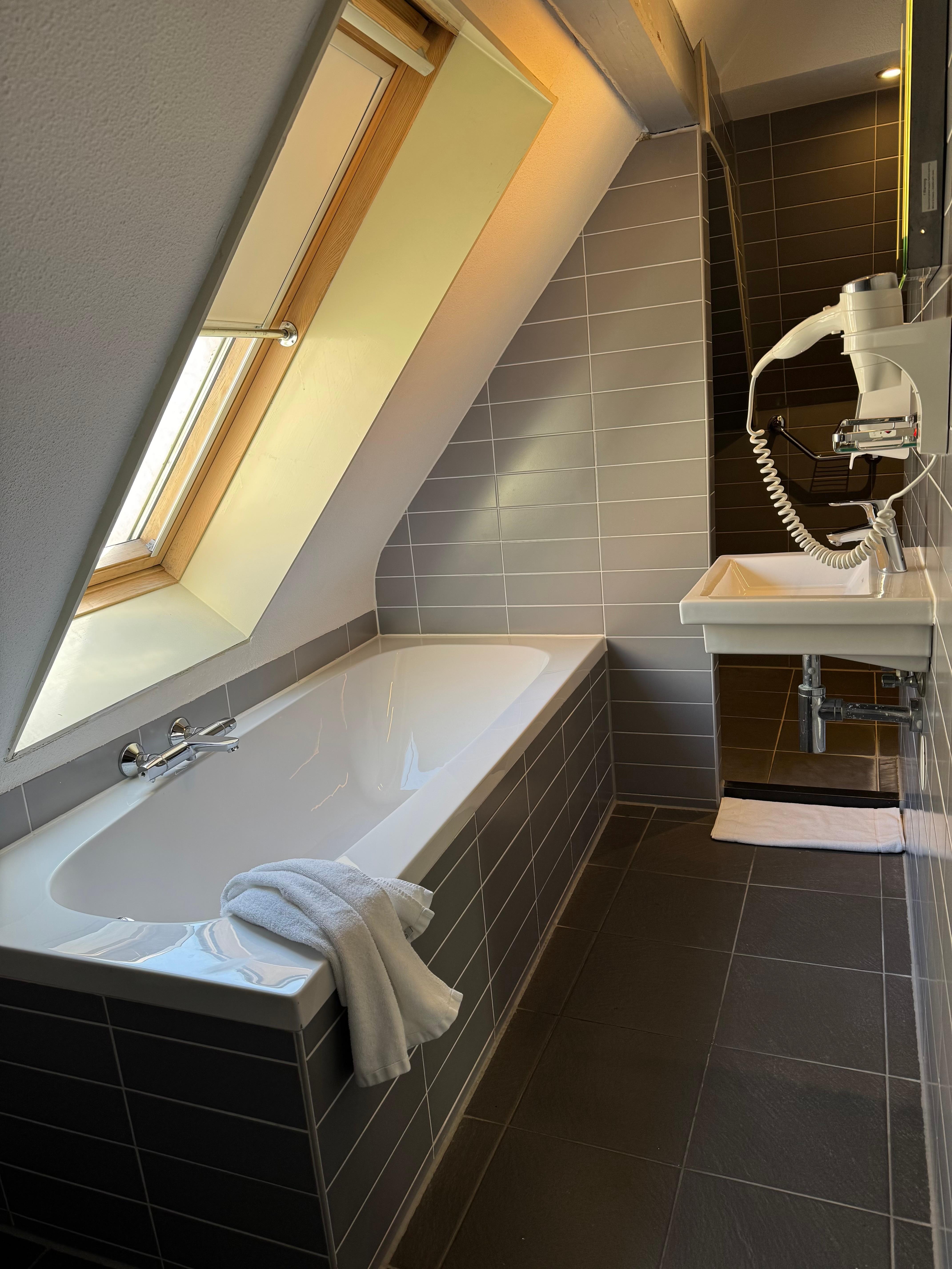 Wir hatten ein Zimmer ganz oben unterm Dach, erreichbar per Aufzug und über sehr schmale Treppen – das Hotel ist insgesamt etwas verwinkelt. Das Zimmer war sauber und zweckmäßig ausgestattet, für uns zwei völlig ausreichend. Für größere Personen könnte die Dachschräge im Bad etwas unpraktisch sein.