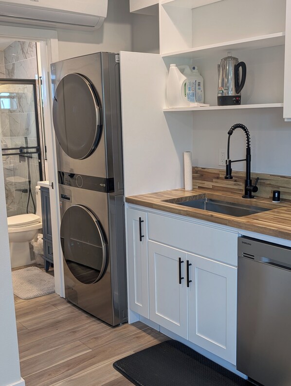 This guesthouse is recently remodeled so everything is modern, clean, and in amazing condition. The guesthouse has mini split, with fans in both the bedroom and living room. You will enjoy the plush memory foam carpet pad in the room along with blackout dual shades. There is a lot of natural light throughout the place. The Kitchen fully furnished with: coffee machine, toaster, pots, pans, and utensils. The bathrooms fully furnished. Iron and iron board in the bedroom closet and there is also a washer/dryer for convenience. There is a Smart TV, and High Speed Wi-Fi. A long driveway that can hold up to 2 cars on the right side (as it is shared) with an available EV charger (upon request).