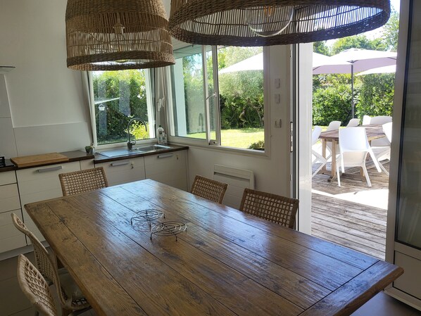 Stort kjøkken på 18 m2 med utsikt over terrassen + pantry: kjøkken med et stort bord 8 personer: oppvaskmaskin, stekeovn og mikrobølgeovn integrert, kaffetrakter nespresso, kaffetrakter