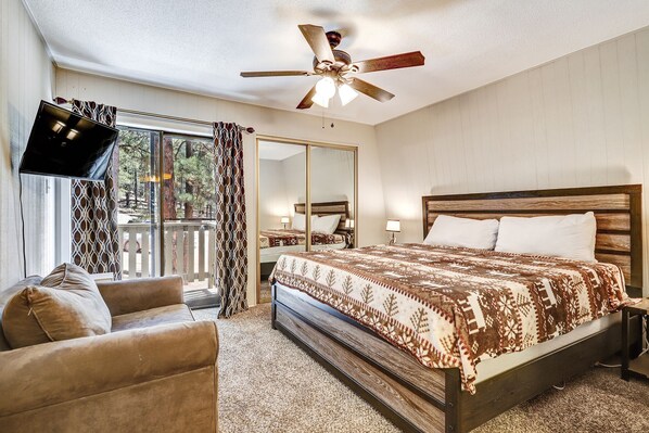 Welcome to Pinetree 215! This two-bedroom/two-bathroom condo that sleeps seven is the perfect getaway. The primary bedroom has a king bed with an ensuite bathroom. The second bedroom has twin over double bunk bed. There is additional sleeping space in the family room on the queen sleeper sofa. The kitchen has updated appliances along with all essentials needed to cook the perfect meal. Relax in the living room while watching your favorite show or movie on Roku TV. The dining room table seats up to four. Take in the fresh mountain air on the balcony while checking out the wildlife. Enjoy the convenience of free WiFi. Clothes washer and dryer are available in the community laundry room (coin-op). Pets are welcome! There is a 2-dog max and fees apply. Please note this condo is on the 2nd floor and there are 20 steps to reach the front door. The fireplace is not functional at this time; we apologize for the inconvenience.