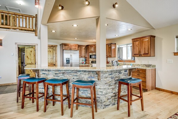 The home has a delightful rustic ambiance with modern touches here and there - it's just the best of both worlds! The sunny living room invites you to spread out comfortably on any of the sofas as you take in the beautiful views and enjoy all the natural light that comes in. Turn on the gas fireplace to get all warm and toasty during the winter months. The extensive dining area is perfect for large family meals or board game nights. Prepare delicious culinary masterpieces in the well-appointed kitchen, complete with all stainless steel appliances and gorgeous cabinets. There is bar seating in case you ever need additional dining spots. Additional perks include free WiFi and an on-site washer/dryer.