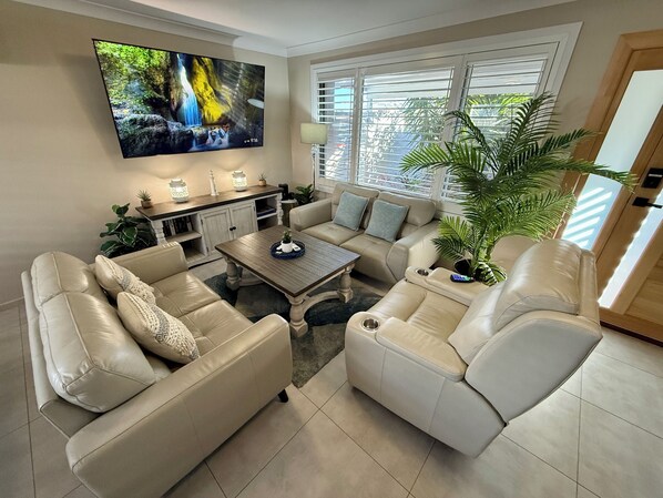 Birubi Blue is a 3-bedroom house, recently refurbished with plenty of free parking spaces and room for a boat. Bedding for a maximum of 7 (six adults and one child). Master bedroom has a queen bed. Bedroom 2 has a queen bed. Bedroom 3 has a tri-bunk (double below and single on top suitable for a child only). Big screen smart TV’s are located in the lounge room and two bedrooms. Outdoor under cover BBQ area complete with a modern table and chairs setting. Fully equipped kitchen with stone bench tops. Centrally located bathroom with a shower, stand-alone bath and separate toilet. There is an outdoor shower to help wash away the sand after a big day at the beach.