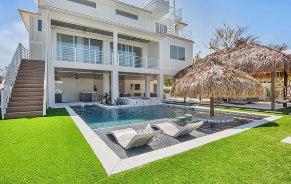 Outside, unwind in your private oasis. The sparkling pool overlooks the serene canal, providing a tranquil spot for sunbathing or a refreshing dip. The hot tub invites you to relax under the stars, while the outdoor kitchen is ready for barbecues and gatherings. The highlight of your outdoor space is the charming tiki hut, complete with swings for lazy afternoons.