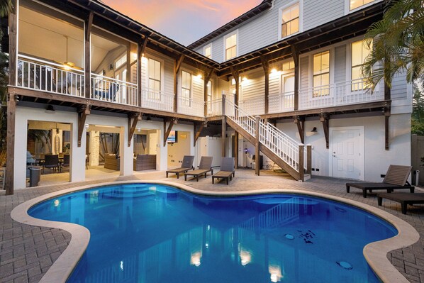 The backyard is a private tropical paradise with a sparkling pool surrounded by lush landscaping, perfect for soaking up the Florida sunshine. Relax in the comfortable wicker seating under the covered patio, enjoy evening cookouts on the BBQ grill, or dine at the outdoor table. Rinse off in the outdoor shower after a beach day, then head up to the rooftop deck to watch the sunset paint the sky over the Gulf.