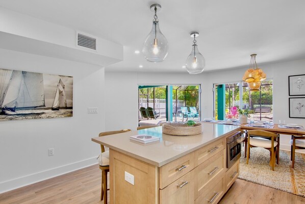 Hurricane House has been completely remodeled with stunning upgrades, high-end finishes, and all-new furnishings. The open-concept living area features vaulted beam ceilings, coastal artwork, and a warm, inviting design that makes you feel instantly at home. The modern kitchen is equipped with stainless-steel appliances, a large island with bar seating, and all the essentials for cooking your favorite meals. A bright dining area overlooks the pool, perfect for gathering with family and friends.