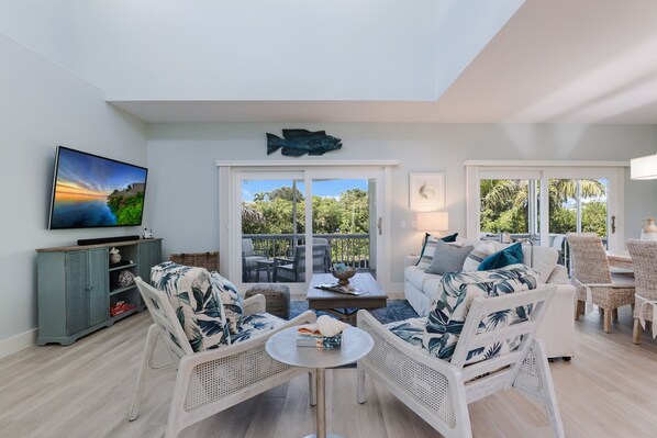 Inside, the home’s open floor plan welcomes you with abundant natural light, tall ceilings, and stylish coastal furnishings. The living area features a plush sofa, tropical chairs, and large sliding doors that open to a screened-in balcony with ceiling fans, conversational seating, and a dining table. The fully equipped kitchen offers stainless steel appliances, broad countertops, ample cabinetry, and a center island with seating, flowing seamlessly into the formal dining area.