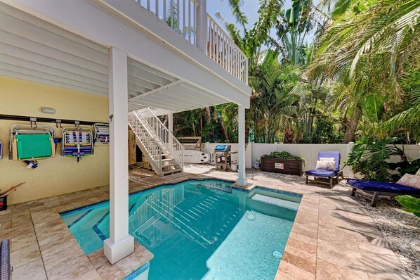 The Pool area is surrounded by professional lush landscaping for your privacy. The heated pool is half-covered to keep cool from the Florida sun during the summer months. Light up the gas grill for a bar-b-que with family as you relax in your own private tropical oasis. Just off the Pool area, the garage has been converted into a Hang out room with a Flat Screen TV and Ping Pong table for your enjoyment!