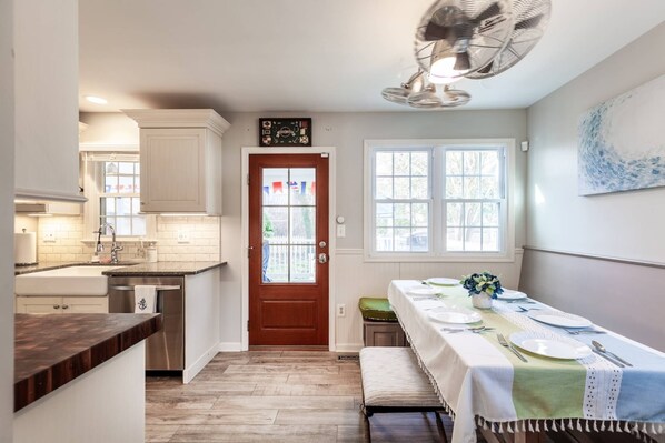 This home's full kitchen, dining area, family room, bedroom with Queen bed and full bath are on the main floor. The kitchen is fully-stocked with cookware, stainless steel appliances and a chef's butcher block built into the countertop. The custom dining room table is built in to allow up to 8 guests to gather and enjoy a family meal. Head out to the 4-seasons room/screened-in porch and private backyard.