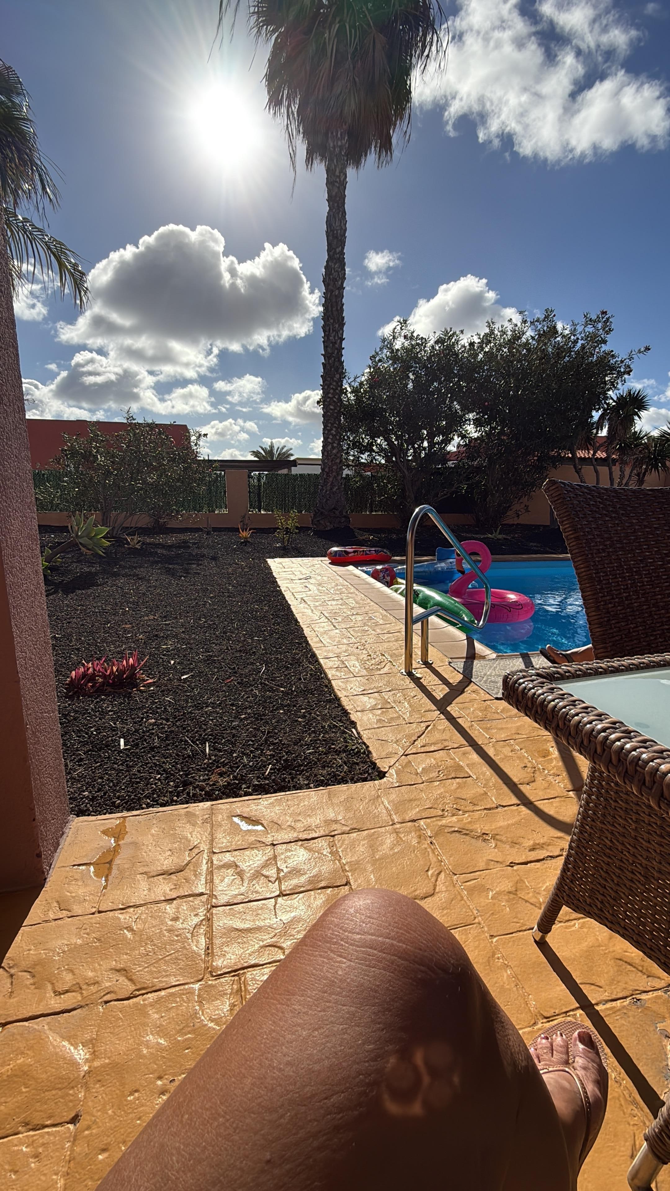 Den 10m x 4m oppvarmede bassenget har en varmvann soloppvarmet dusj som ligger ved siden av. Det er rikelig med terrasser rundt bassenget med en rekke kvalitets solsenger og et attraktivt patio bord og stoler. Det er trapper på siden av villaen som fører opp til en helt privat og bortgjemt solterrasse eller solterrasse. Hageområdet er fullt anlagt med et stort utvalg busker, tropiske planter og keramikkpotter.