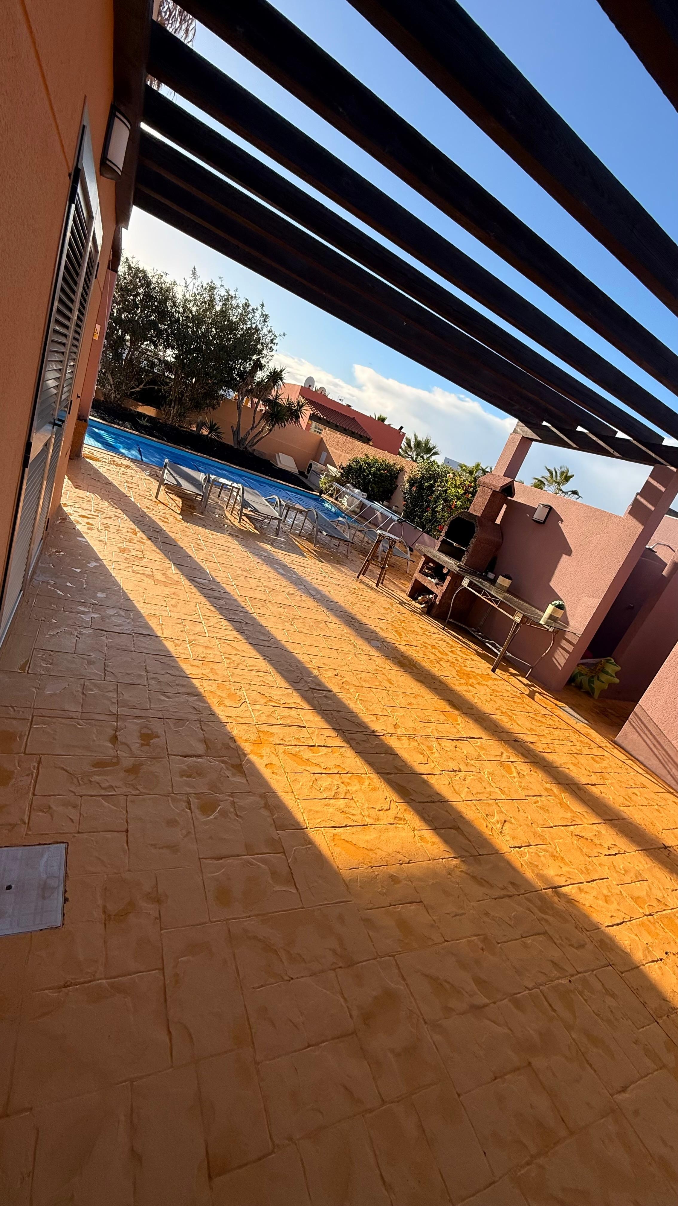 Det er to sett med patio dører fra villaen, en leder direkte ut mot bassengterrassen og den andre fører til en pergola overbygd uteplass.
