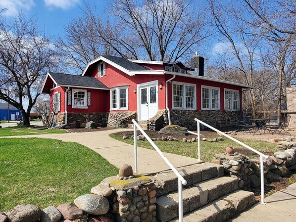 - The main house has two outdoor seating areas, one with grills and both peekaboo views of the lake;