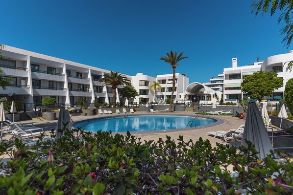 The swimming pool and deckchairs are waiting for you.