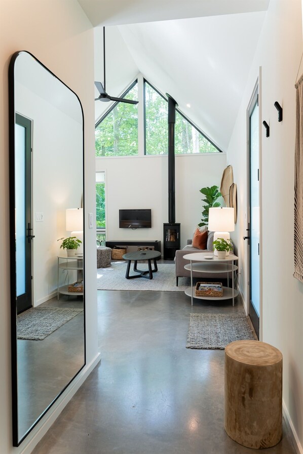 Cabin #48 at Firelight at Shope Creek shares 22 acres of wooded and creek side property with seven other cabins in the beautiful Shope Creek area of east Asheville. This newly built modern cabin is nestled into the valley, just minutes from Pisgah National Forest access, where hiking and biking trails are plentiful. Downtown Asheville, the Blue Ridge Parkway and Warren Wilson College are within 15-20 minutes away. Get the best of both worlds with access to vibrant city attractions and the natural beauty that makes WNC so famous.