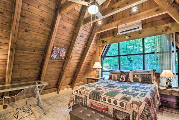 Guests have full access to the entire A-frame cabin, fenced yard, hot tub, and game room.