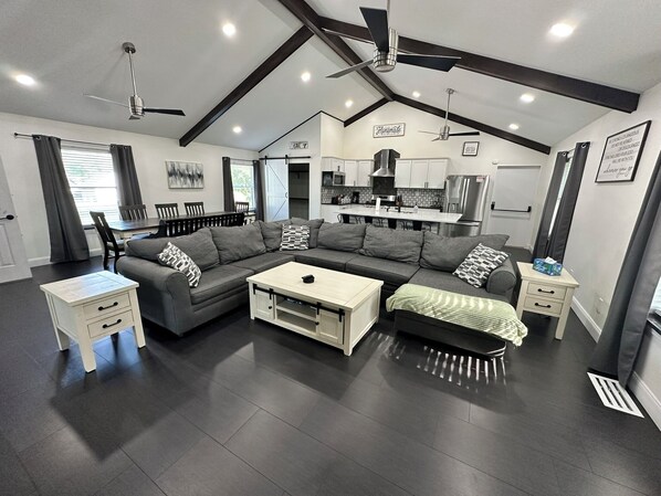 ▪️Spacious living room with a large sectional sofa, board games, electric fireplace and smart TV