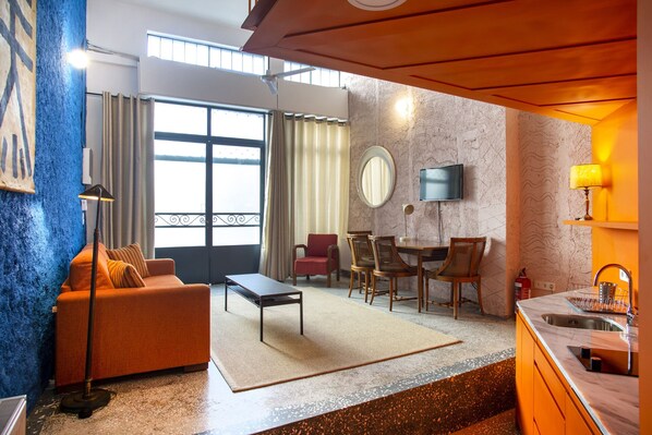 Thoughtfully crafted for comfort and flexibility, this open-plan studio accommodates up to three guests: two on a queen-size bed on the mezzanine (which can also be set up as two singles), and one on the sofa bed in the living area.