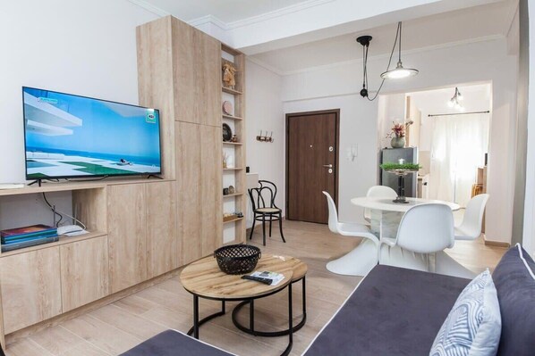 Step into the sophisticated charm of Exarhia Silver Moon, a beautifully designed apartment that blends modern luxury with timeless elegance. Accommodating up to six guests, the apartment includes a cozy living room with a comfortable double sofa bed, ideal for lounging or accommodating extra guests. The two main bedrooms each feature a plush double bed, ensuring a restful night's sleep after a day of exploring the city. Each room is tastefully decorated, providing a serene and inviting atmosphere.