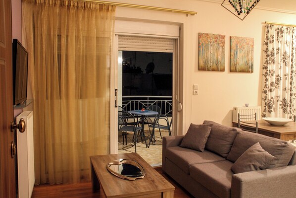 The living room and kitchen space is lovely and modernly furnished, which also gives access to the big front terrace. A comfortable sofa, which turns into a very good bed for 2 more people, a sofa table and a flat 32” LCD- TV are available in the room. A/c unit available.