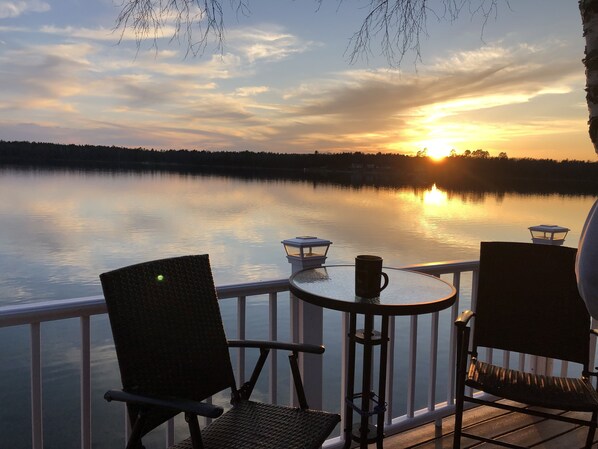 You can enjoy the outside under the covered patio with ceiling fan and seating, or take the cooler and gather down at the lake or sit on top of the boat house which has high top tables and chairs to relax and enjoy the lake activities and the beautiful sunsets. Also a 2 person swing in the yard for you to enjoy. There is a small sand beach area at the lake with 2 chaise lounge chairs, an additional small firepit on the beach, a 30 foot dock which you are welcome to bring your own boat or jet skis to dock to, and also a swim raft and a floating mat in the water. Please let us know if you are bringing a boat . There are kayaks and paddle boards for you to enjoy. You can catch fish right off the dock the water is so clear. I suggest you bring your own lake toys and floating devises, fishing poles and bate. There is a nice fire pit area for hot dogs/smores and ghost stories around the camp fire with seating and picnic tables, it’s a great area for yard games and evening star gazing. There is a Disc Golf course on the lake open to the public at the day park at the State Park on the lake. The State Park rents e-bike to use on the local trails. Many golf courses within 30 miles. For the ORV, Snowmobile riders there are miles of great trails for riding, just let us know so we can accommodate your trailers.