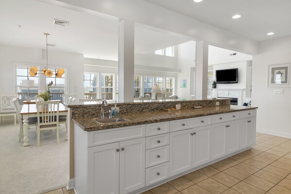 Den har innredning som fokuserer på en 42-tommers LCD-TV med HD-kanaler og kabel. Full størrelse sofa og kjærlighet sete. Bak pannen er spisestue og bord med plass til 8, med ekstra sitteplasser for tre på kjøkkenbaren. Kjøkkenet er veldig romslig for matlaging måltider med masse granitt benkeplater.
