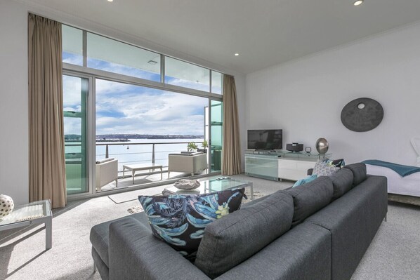 ✔ Living room with marina-facing windows