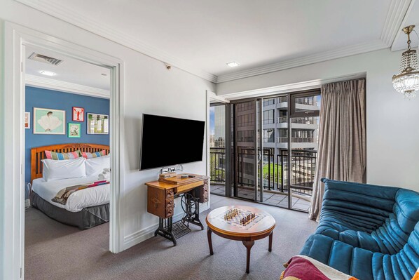 • Living Area: Unwind in this lovingly curated, open concept living area complete with a Smart TV. The modern lines are juxtaposed with antique details, for a luxurious yet warm feel.