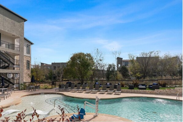 ✔ Large outdoor community pool with lounge area for hanging out and cooling off in the hot Texas summer