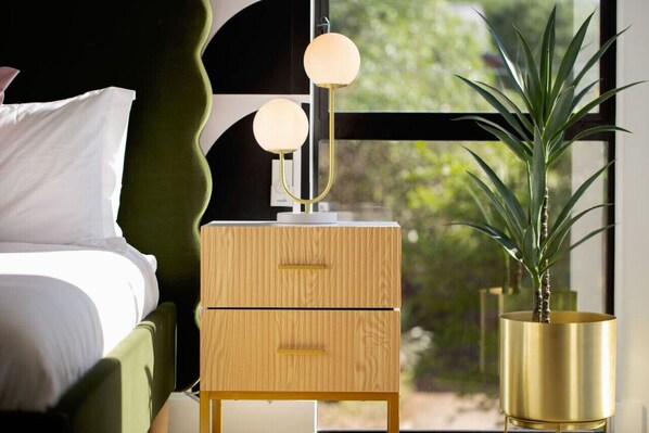 In the backyard, surrounded by bamboo trees, a private Casita, with its own en-suite bathroom well-stocked with essential toiletries and quality linens. A modern queen bed with two walls of floor-to-ceiling windows brings natural light and direct access to the pool and spa. To allow for late sleep-ins, windows feature full-length blinds on all windows.