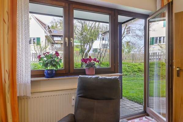 Quiet and centrally located apartment. The town center, spa gardens and thermal baths are just a few minutes' walk away. Comfortably and tastefully furnished apartment, accessible at ground level and barrier-free. Covered terrace facing east, which offers pleasant shade from midday in summer and invites you to linger. Another apartment of the same size and location is available on request.