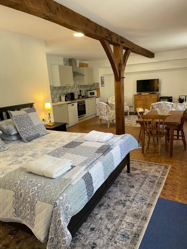 Bright and cozy open-plan studio combining rustic charm with modern comfort.