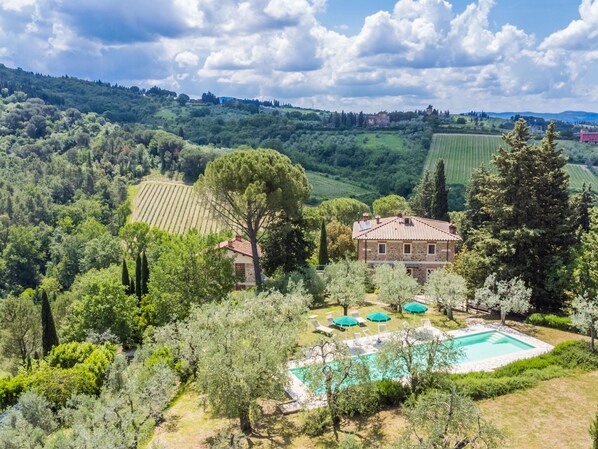 Koselig hytte "Fienile di Policleto", 350 m.o.h. Omgitt av enger og vingårder. Eiendom bestående av hovedhus og uthus 6 km fra sentrum av San Polo in Chianti, 6 km fra sentrum av Grassina, 15 km fra sentrum av Firenze, i en avskildt, høyt posisjon, i det grønne. Fellesbruk: tomt 10'000 m2, hage i flere nivåer (uten gjerde) med trær, gård. Privat: svømmebasseng (17 x 4 m, dybde 120- 220 cm dyp, Sesongåpent: 01.Mai. - 15.Okt.) med bassengrensningssystem med saltelektrolyse. Utendørs dusj, grill, Underholdning av bassenget av eieren/gartneren. I huset: sentralvarme, airconditioning. Parkering på tomten. Butikk 2 km, daglivarehandel 2 km, supermarked 6 km, restaurant 2 km, bussholdeplass 7 km. Golfbane(19 hull) 7.5 km, tennis 6 km. Attraksjoner i nærheten: Greve in Chianti 15 km, San Gimignano 55 km, Siena 70 km. Vennligst merk: bil anbefales. Babyutstyr (inkl.). Eieren godtar ikke noen ungdomsgrupper. Eieren bor i en enebolig. Eieren har hund. Dyr i nabolaget.