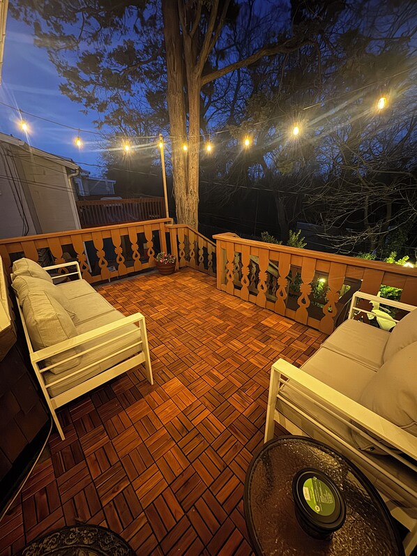 This apartment is spacious and very charming, with its modern German cottage vibe, and back yard garden area. Bedroom has tons of natural light that comes in, with its own TV and wardrobe so you can feel at home. This apartment has a flexible room which can be used as a formal dining room, office space or to sleep 2 more on a Queen Murphy bed. Spacious living room, with hidden washer and dryer. This 1st floor apartment (of a duplex) is truly unique and very welcoming!