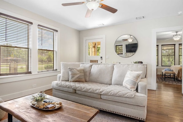 Three bedrooms, along with an additional bunk room, provide great sleep space for up to a dozen people (please be aware the bunk room is only available for groups of more than six). That's one king-sized bed, two queens, and two sets of queen and twin bunk beds in all! The master bedroom and bunk room have their own smart TVs. Two spotlessly-clean full bathrooms are shared among the sleeping spaces, and have shower and tub combos for your cleanup needs. Fresh bed and bath linens are provided for everyone.