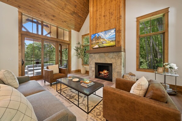 Step inside to find a warm, lodge-style interior with elevated ceilings, a stone fireplace, and an open-concept living space perfect for relaxing after a day of adventure. The fully equipped kitchen and dining area make it easy to enjoy home-cooked meals or game night around the table.
