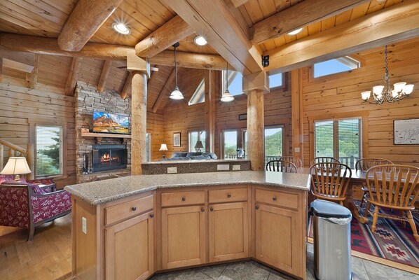 Hovednivået i hjemmet har en romslig stue med 25 meter høyt utsatt stråle katedral tak, et åpent kjøkken, spisestue, en mudroom med masse kleskroker og et halvt bad. Spisebordet seter 8, med 4 ekstra avføring på kjøkkenbaren. En 42 "plasma-TV henger over steinen vedovn i stuen (begrenset brensel leveres.) En av soverommet suiter ligger på dette nivået, med en king size-seng, HDTV med DVD-spiller og en privat dekk. Det private badet ved siden av dette soverommet har et badekar i hagen og separat dusj.
