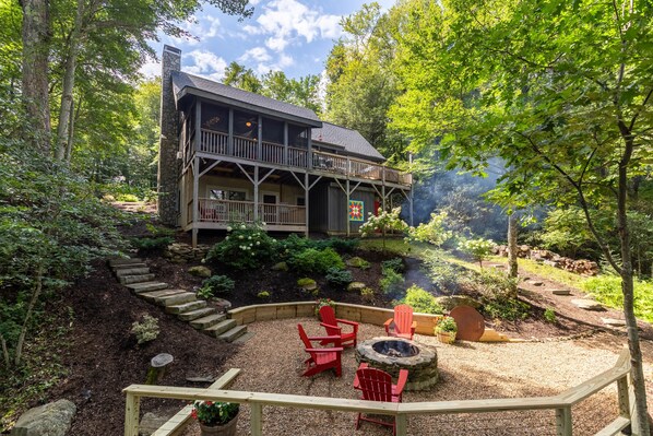 Hytta har ca 2.000 kvadratmeter på tre nivåer med 2 store soverom, hems, 2 fulle bad, stue, spisestue, fullt utstyrt kjøkken, vaskerom, trådløst internett og en overbygd veranda med gyngestoler og en veranda swing. Et stort åpent bakdekk gir utsikt over Hawksnest Mountain fra det store boblebadet, som ligger like utenfor soverommet.